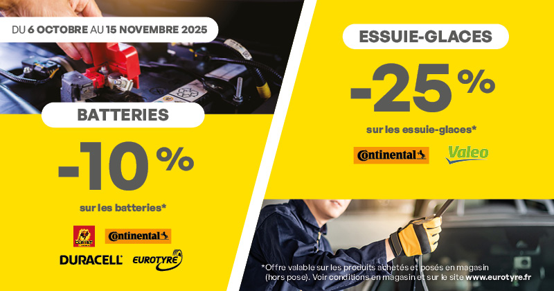 *Offres réservées aux particuliers valables du 6 octobre au 15 novembre 2025, pour tout produit acheté et posé dans le(s) point(s) de vente Eurotyre mentionnée(s) dans la liste des participants ci-dessous et dans la limite des stocks disponibles. Voir conditions en magasin. Prix communiqués TTC. Offres non cumulables avec d’autres opérations en cours.