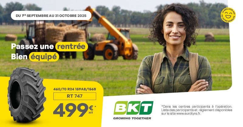 Passez une rentrée bien équipé, du 1er septembre au 31 octobre, profitez de nos offres sur les pneus agricoles BKT.